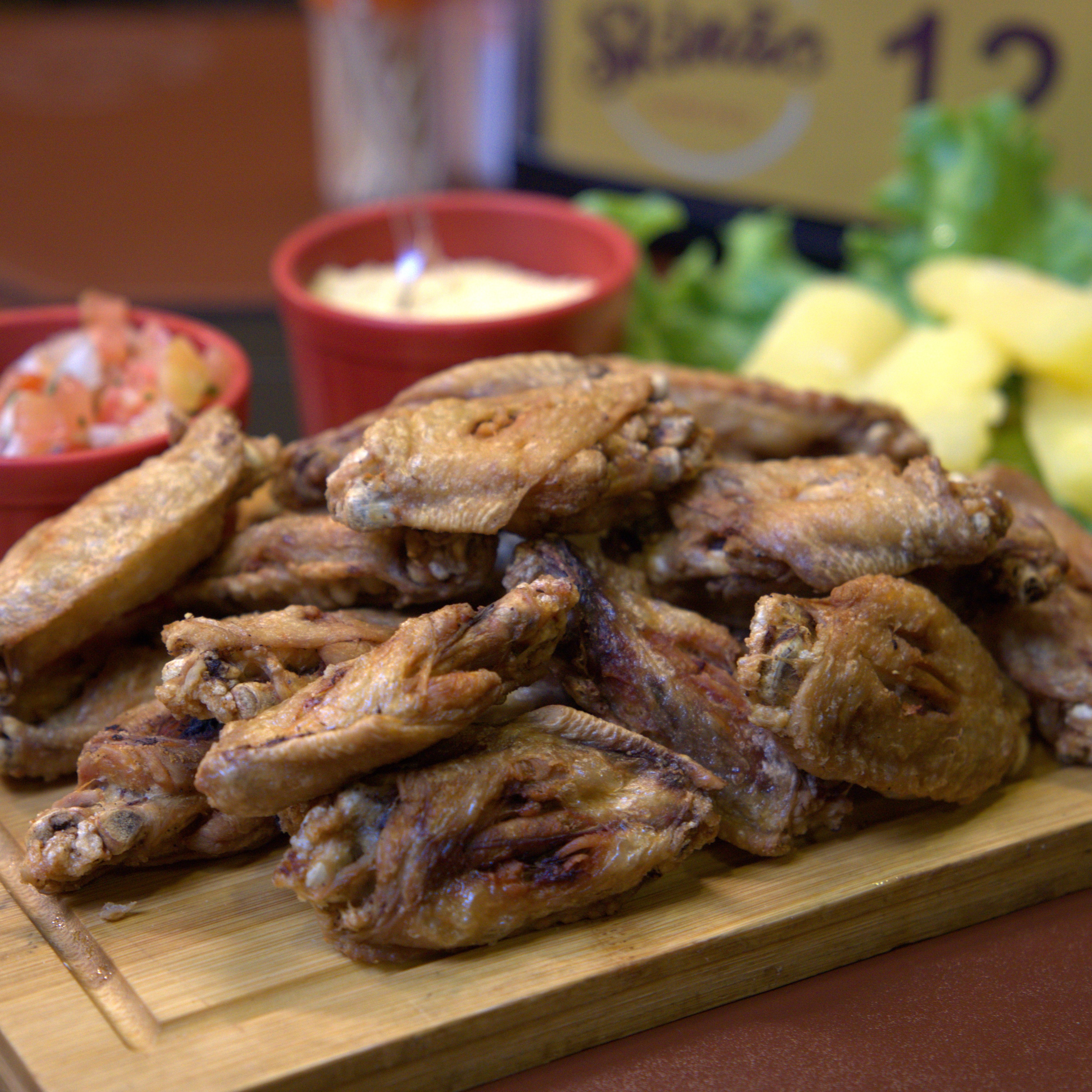 Porção de Tulipa de Frango acompanhada de vinagrete, farofa e mandioca cozida